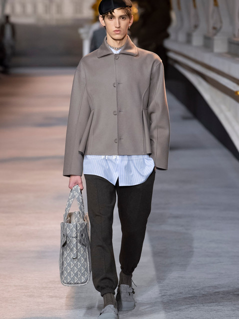So Jones filled the collection with a few of Dior’s biggest signatures. There is the famous Bar jacket, the architectural “eight” silhouette with a nipped in waist and padded hips, reinterpreted for men with a softened wrapped shape. Dior’s beloved gray, the color of the Paris sky on a rainy day, was the foundation of the collection’s palette. The collection took place on a set modeled after a Paris bridge—a metaphor for Jones, but also reminiscent of many of the locations of the Richard Avedon photographs that cemented the Dior image. And then there were many of Dior’s own passions: the rose, the cannage print Dior derived from Parisian cane chairs, and the Lily of the Valley scent the designer loved. Even the Birkenstock collab was a nod to Dior, intended as a modern interpretation of the gardening shoes the designer wore while tending to his beds.