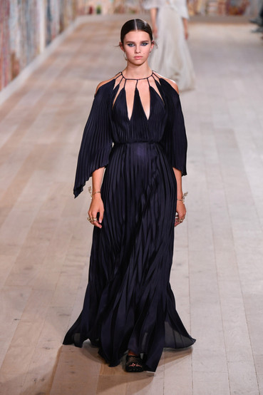 As a result, eveningwear focused on her signature pleated gowns in barely there chiffon, dyed in gradient colors, and braided into basket-weave bustiers. Monochrome gazar gowns with graphic shoulder straps concealed geometric patterns in their knife-pleated folds.