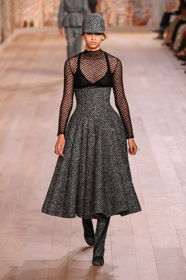 The inspiration was a 1963 Dior couture collection by Marc Bohan featuring tweed jackets and skirts with coordinating scarves and helmet hats. Chiuri went for a similarly allover look, pairing tweed separates with matching hats designed by Stephen Jones, tweed boots and tweed-effect knits for maximum textural effect.