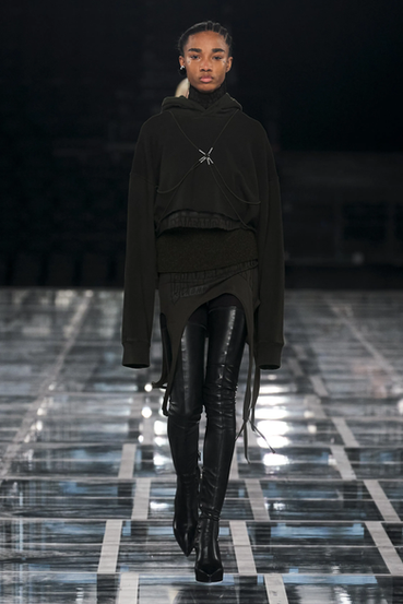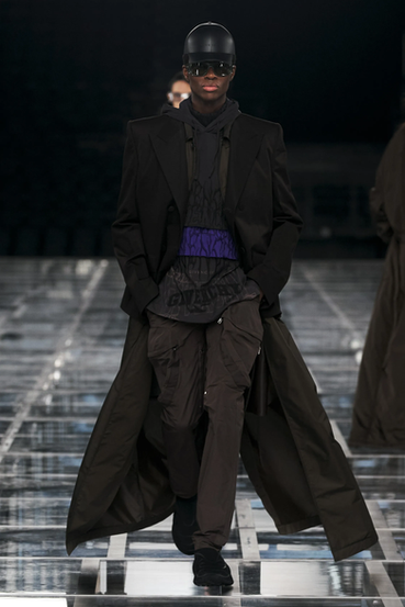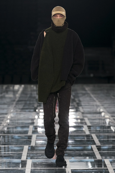 Rendered largely in dark green and black, the collection was a mainly streetwear-focused wardrobe composed of the stereotypes that come with the territory, at least from a fashion perspective: layered and tiered T-shirts and sweatshirts with logo graphics in the vein of metal band merchandise; baggy denim trousers and leather tracksuits; and voluminous floor-length pimp coats that floated along the stadium-like structure bathed in the light of four surrounding LED lamps that looked like those used on football fields.