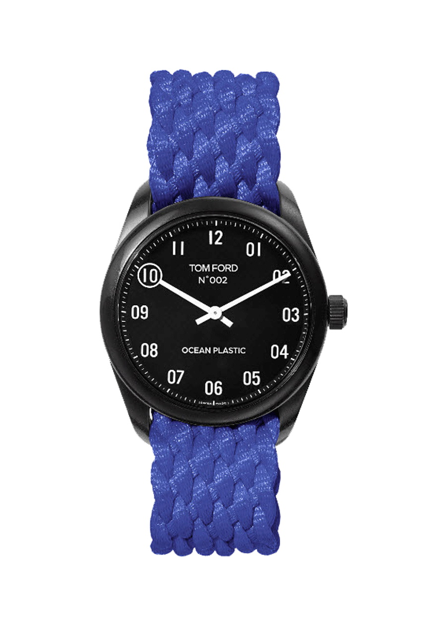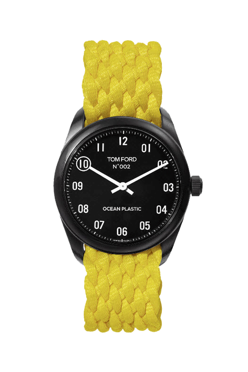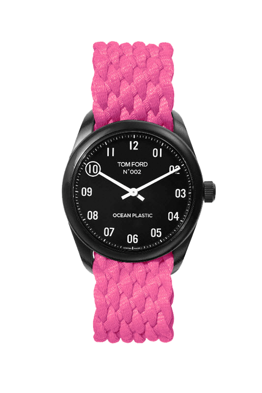 Tom Ford has launched three new colorways of its Ocean Plastic Timepiece, made entirely from plastics recovered from the world’s oceans. Each of the timepieces comes with interchangeable braided straps, in either black, deep blue, bright yellow or hot pink, and finished with a matte black dial.